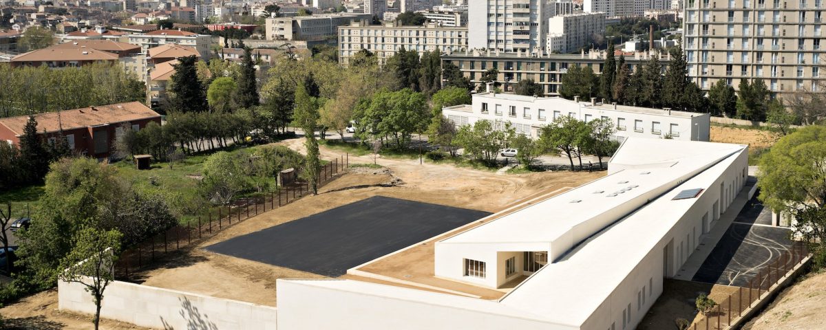 The new complex, imagined by the COMBAS architecture office, formed a large U-shape, designed to host the children on the ground floor, in a warm and enveloping form. At the entrance, a portal opens first onto the first courtyard shaded by an ancient ash tree, on the south side of the building, an orchard revives the agricultural identity of this property formerly run as a truck farmer of the northern neighborhoods of Marseille.