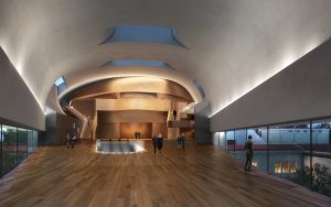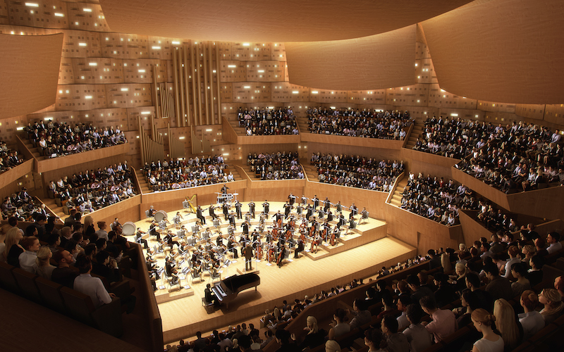 The smooth case of zinc holds an “instrument” in an extended vineyard-type plan made of concrete and maple wood. Czech composer, Leoš Janáček’s theories of time will guide and give order to the concert hall’s interior geometry. Acoustic wall panels are organized according to scasovani, or rhythm, in three variants.