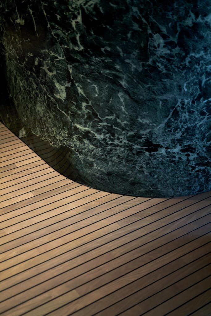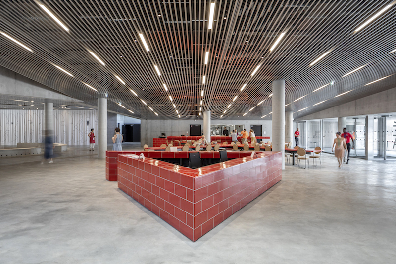 Upon entering MÉCA from the ground floor, visitors arrive at the lobby where they can relax in the spiral pit or dine at the restaurant Le CREM, furnished with red furniture and cork chairs designed by BIG in reference to the city known for wine. A giant periscope by the restaurant and elevators allows visitors to see the activity in the outdoor urban room and vise-versa, creating an indoor-outdoor dialogue. On the same ground floor, those with tickets can enjoy performances in OARA’s 250-seat theatre featuring flexible seating configurations and acoustic systems optimized by an all-black checkerboard panel of concrete, wood and perforated metal. Upstairs, filmgoers can view screenings at ALCA’s red-accented 80-seat cinema or visit the two production offices and project incubation area.